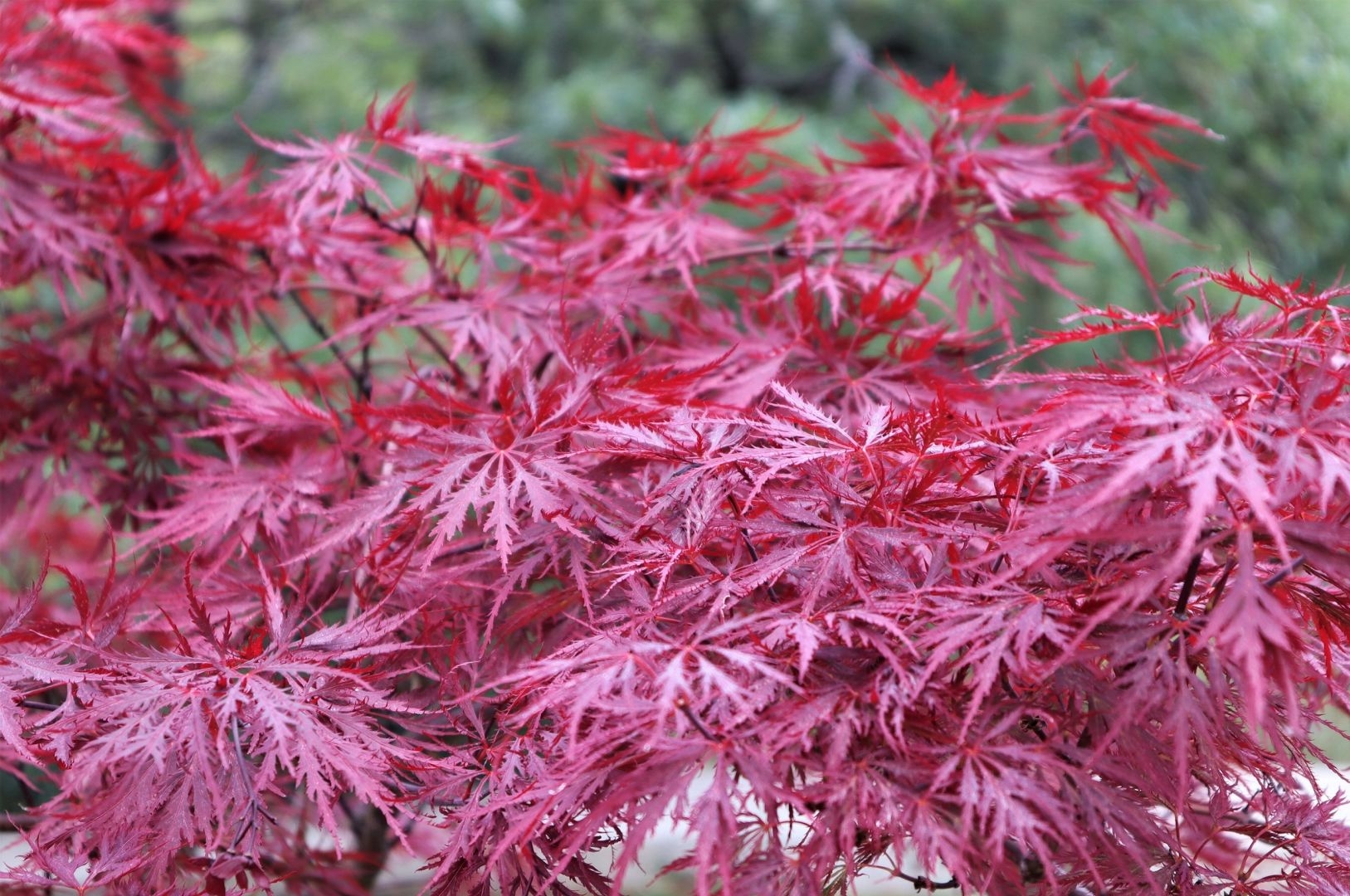 Acer palmatum 'Garnet', kleinblijvende japanse esdoorn met fijnverdeelde bladeren. Het is een gracieuze heester met een bolvormige tot schermvormige kroon. Traaggroeiend en vooral populair omwille van zijn schitterende bladeren en herfstkleuren. De vijf tot negenlobbige diep ingesneden bladeren zijn roodpaars en kleuren in de herfst tot scharlaken rood. Het is een struik voor iedere soort tuin, park of ook als bonsai te gebruiken. Houdt van zon met lichte schaduw, bij voorkeur in een vochthoudende lichtzure bodem en enigszins beschut tegen stevige wind.