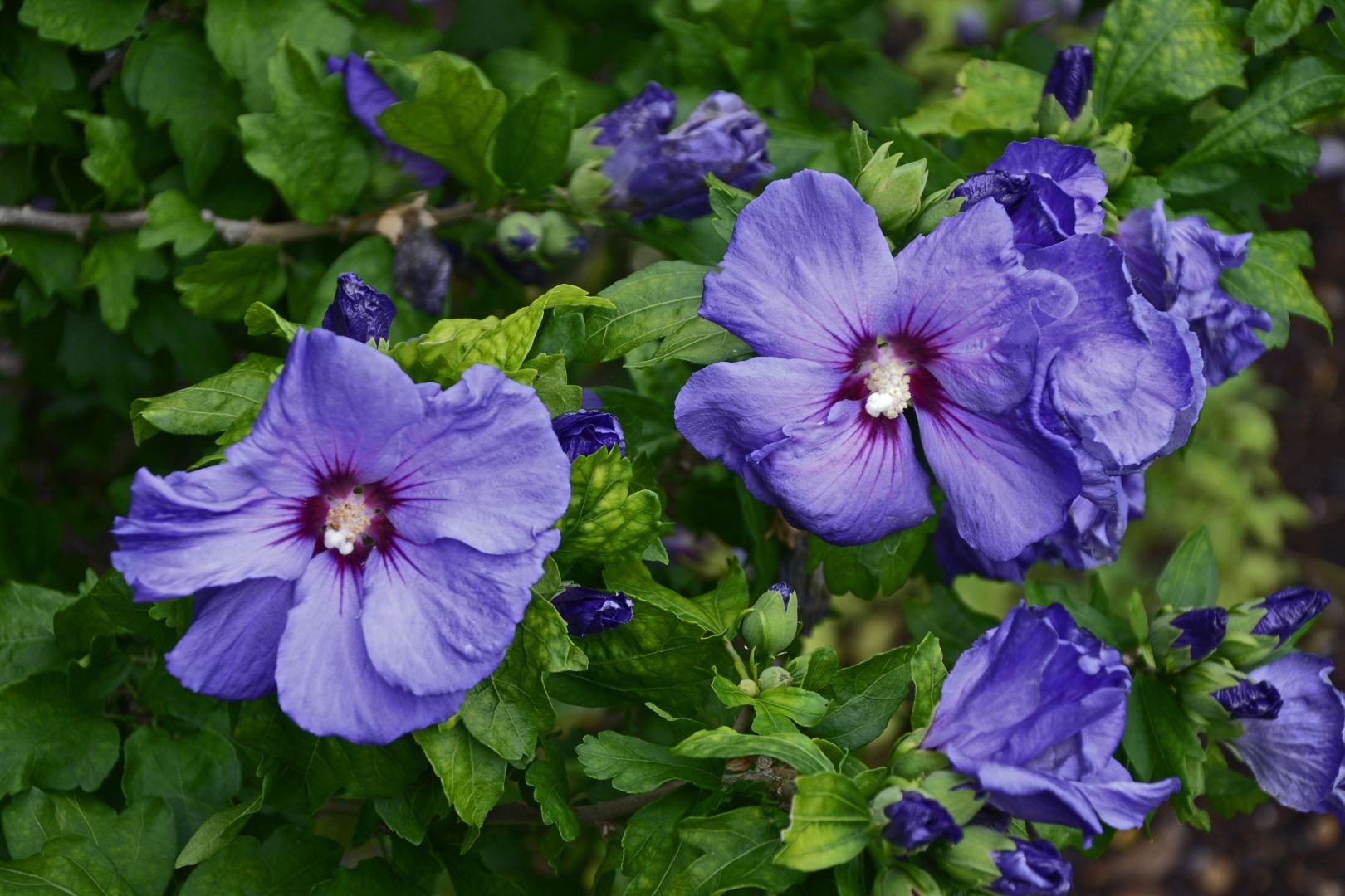 Hibiscus syriacus 'marina' is een middelgrote bladverliezende struik met decoratieve middengroene tot donkergroene grofgetande, handvormige bladeren en een bossige, opgaande habitus. Midden de zomer start de bloei met violetblauwe, enkele bloemen met donkerrood hart. En dit gaat zo door tot oktober. Deze tuinhibiscus doet het zeer goed op een standplaats met lichtjes gefilterd zonlicht, maar ook in volle zon en halfschaduw gedijt hij goed. Hij is niet kieskeurig wat de grondsoort betreft.