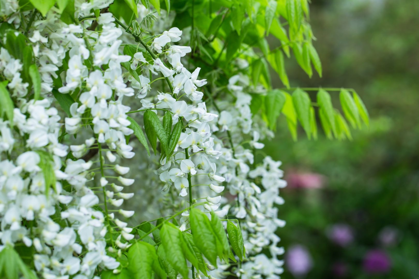 Wisteria sinensis ‘Alba’ is een krachtige opgaande klimplant met lange puntige witte bloemtrossen met een lichtgele vlek, van 30-60cm lang.